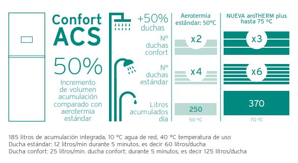 1. 185 litros de capacidad de acumulación integrada, corresponden a mas  de 370 litros de ACS diarios a 40 ºC. Esto supone un incremento de 50% respecto a otras aerotermias.