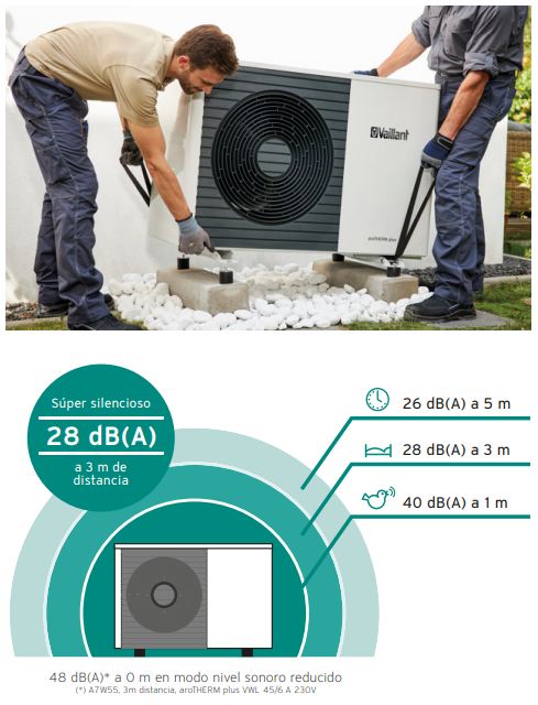 El nivel sonoro de aroTHERM plus es tan solo 28 dB(A) a una distancia de tres metros de la pared del edificio (mejor nivel sonoro que un dormitorio).