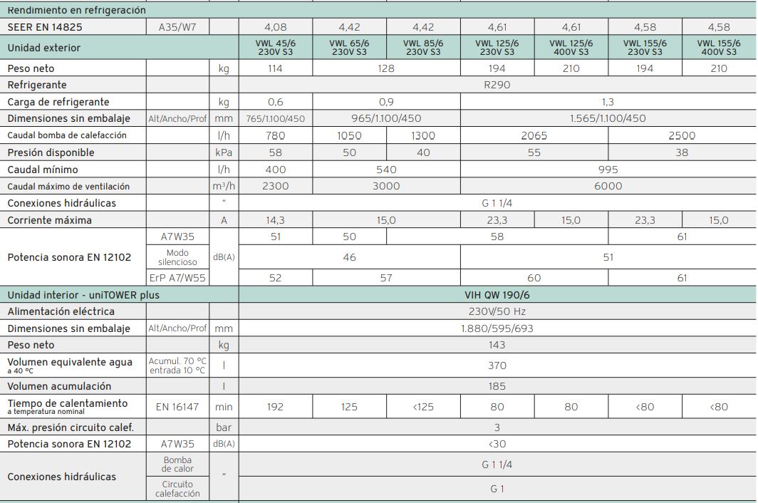 Aerotermia Vaillant aroTHERM Plus 15 400V. Set compuesto por una unidad exterior ( ref.0010021642 )+ Torre hidráulica VIH QW 190/6 ( ref.0010030464 )+ sensoCOMFORT cableado. Diseño integrado. Clase energética A+++/A++. Aerotermia para agua caliente, suelo radiante, radiadores (Funciona hasta 75º) y posibilidad de fancoils. Incorpora unidad exterior, unidad interior y acumulador integrado de 185 Litros. Aerotermia Vaillant 17,4 kw térmicos, para vivienda hasta 160 m2 útiles. Las bombas de calor Vaillant solo utilizan un 25% de la energía que necesitan para funcionar de la red eléctrica. No producen emisiones de gases contaminantes a la atmósfera y el mantenimiento que necesitan para tener un nivel óptimo de funcionamiento es mínimo. 18,1 kW. Potencia Refrigeración 12,8 kW. Refrigerante R290. Incluye SensoCOMFORT Cableado.