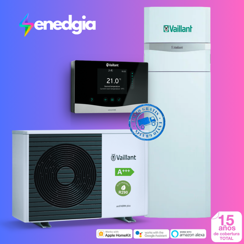 Aerotermia Vaillant aroTHERM Plus 15 400V. Set compuesto por una unidad exterior ( ref.0010021642 )+ Torre hidráulica VIH QW 190/6 ( ref.0010030464 )+ sensoCOMFORT cableado. Diseño integrado. Clase energética A+++/A++. Aerotermia para agua caliente, suelo radiante, radiadores (Funciona hasta 75º) y posibilidad de fancoils. Incorpora unidad exterior, unidad interior y acumulador integrado de 185 Litros. Aerotermia Vaillant 17,4 kw térmicos, para vivienda hasta 160 m2 útiles. Las bombas de calor Vaillant solo utilizan un 25% de la energía que necesitan para funcionar de la red eléctrica. No producen emisiones de gases contaminantes a la atmósfera y el mantenimiento que necesitan para tener un nivel óptimo de funcionamiento es mínimo. 18,1 kW. Potencia Refrigeración 12,8 kW. Refrigerante R290. Incluye SensoCOMFORT Cableado.