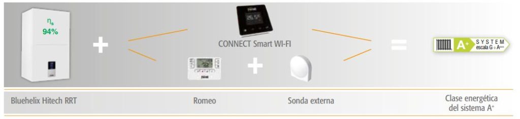 > A+ gracias a la combinación con el mando remoto modulante CONNECT y a la lectura de la temperatura externa directamente desde Internet, alcanza el máximo de eficiencia energética A+ (escala de G a A+++)
