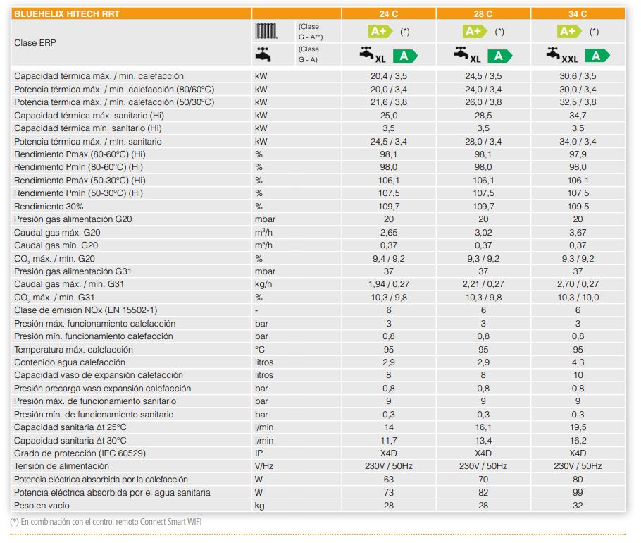 Gracias a la eficiencia energética del calentamiento ambiente ηs 94% entre las más altas de la categoría (Clase A ErP, escala de G a A++) y a la combinación con el mando remoto Connect, es capaz de leer la temperatura externa directamente desde Internet, alcanza la clase energética de sistema A+ (escala de G a A+++). Se adapta fácilmente a las condiciones de carga gracias al amplio intervalo de modulación que puede llegar hasta 1:10 (mod. 34 C).