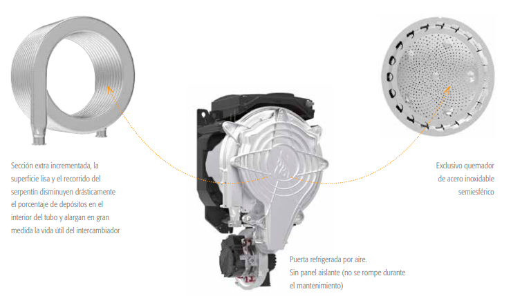 > Exclusivo sistema intercambiador-quemador con puerta dotada de refrigeración automática (sin aislantes): simplifica el mantenimiento y reduce su coste gracias a un menor número de piezas sujetas a deterioro.