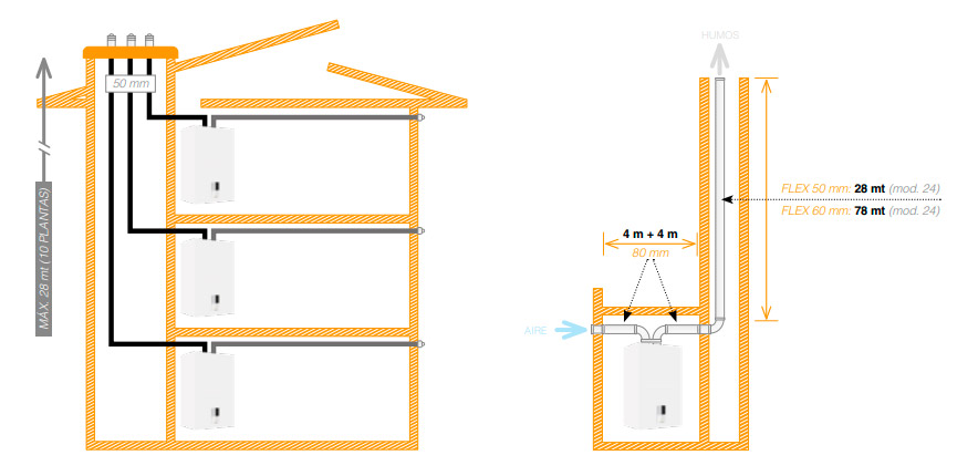 > Especialmente adecuada para el funcionamiento en salida de gases que requieren caldera homologada para poder trabajar con salida de gases de 50 mm