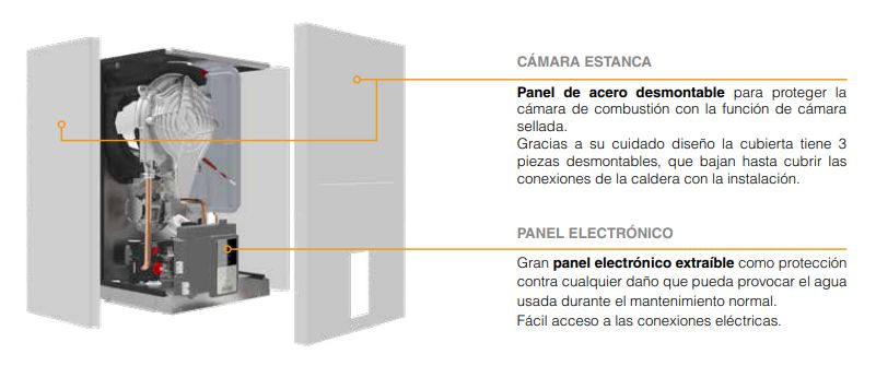 – El quemador se desmonta aflojando solo 3 tornillos dejando libre acceso al intercambiador de acero inoxidable.