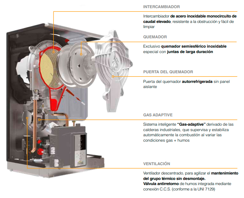 Diseñada para satisfacer plenamente las exigencias de un producto «robusto» desde todos los puntos de vista gracias al intercambiador principal con pasos elevados capaz de garantizar la máxima eficiencia y fiabilidad en el tiempo también, y no solo, en sustitución de antiguos generadores en sistemas especialmente sucios.