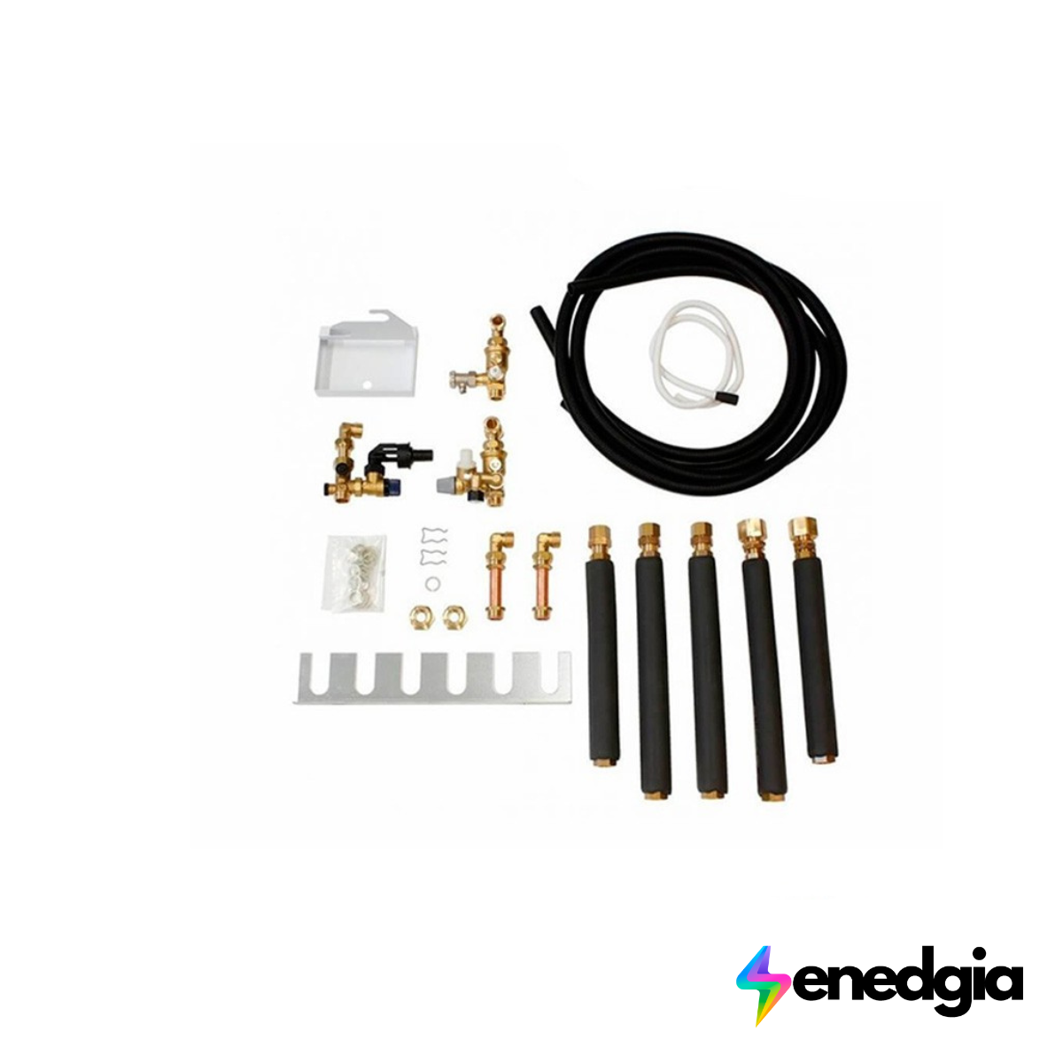 Kit instalación: Válvulas de servicio, válvula de seguridad de 3 bar y 10 bar para ACS, mamómetro, basndeja de condensados y tubos flexibles de conexión.
